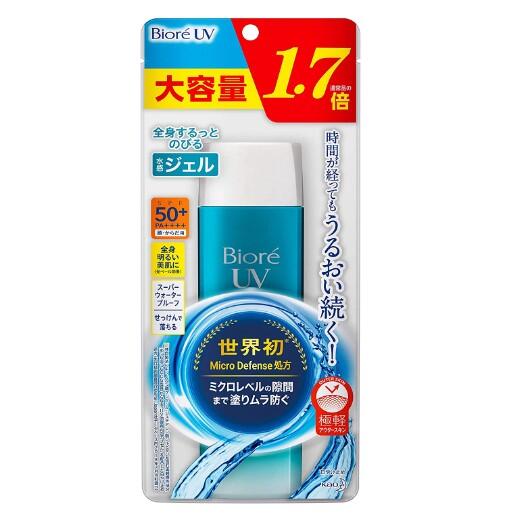 - Kao’s Biore UV Aqua Rich Watery Gel SPF 50+ PA++++ is an ultra light sunscreen for face and body.